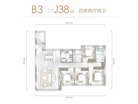 138㎡橫廳四房戶型:5.6米橫廳|大四房設計|中西廚島臺