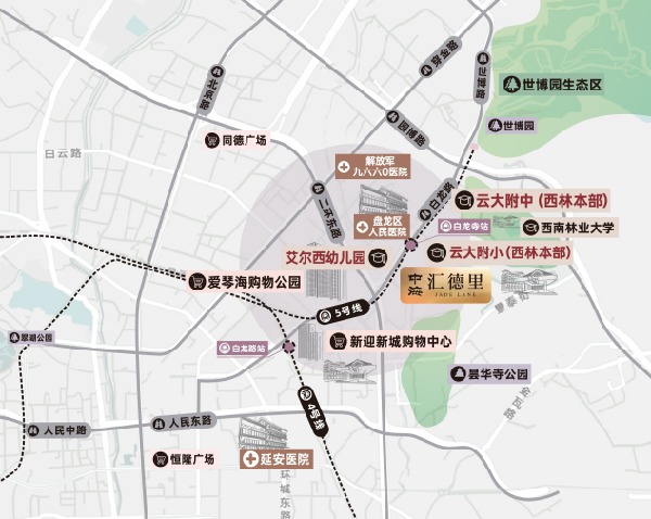 中海匯德里地處二環核芯地段,周邊配套設施齊全。1km 內可達愛琴海、新迎新城商圈,3.5km 內可達恒隆及同德商圈,滿足居民的日常購物、休閑娛樂需求。交通方面,4/5 號線已通車,4號線距離項目約1.5km,5號線距離項目約600m ,便捷的交通網絡可以輕松暢達城市各處。醫療資源也十分豐富,擁有延安醫院、中國人民解放軍醫院、婦女兒童醫院、昆明市中醫院、盤龍區人民醫院等,為居民的健康保駕護航。周邊還有曇華寺公園,世博園等生態公園,讓居者在城芯也能親近自然,享受愜意時光。