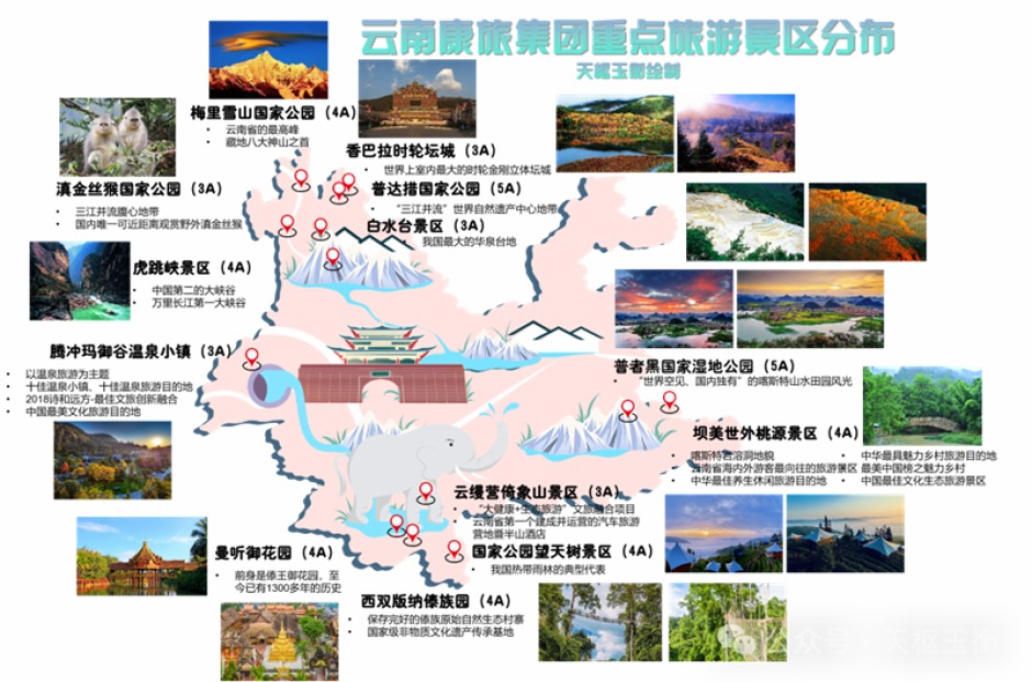 一是旅游景區(qū),康旅集團(tuán)目前擁有普達(dá)措國(guó)家公園、普者黑國(guó)家濕地公園2個(gè)AAAAA級(jí)景區(qū),虎跳峽、梅里雪山國(guó)家公園、西雙版納傣族園、曼聽御花園、望天樹景區(qū)和壩美世外桃源景區(qū)6個(gè)AAAA級(jí)景區(qū),滇金絲猴國(guó)家公園、香巴拉石輪壇城、騰沖瑪御谷溫泉小鎮(zhèn)、白水臺(tái)和云縵營(yíng)倚象山景區(qū)5個(gè)AAA級(jí)景區(qū),形成了以滇中為輻射中心,滇西北、滇西南和滇東南核心文旅資源、精品旅游線路為支撐的旅游資源布局。2023年,康旅集團(tuán)旗下各景區(qū)全年接待消費(fèi)游客突破1200萬人次。