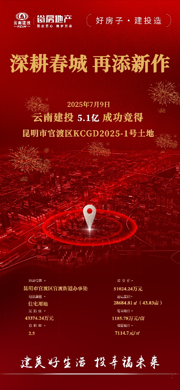 7月9日,云南建投集團以51024.24萬元競得昆明市官渡區核心區一宗優質住宅用地,這是繼今年4月成功摘得昆明市五華區蓮華街道地塊后深耕春城的又一重要布局。此次落子地塊緊鄰文化地標官渡古鎮,坐擁城市核心資源與優質生態,將為昆明品質人居再添標桿之作。