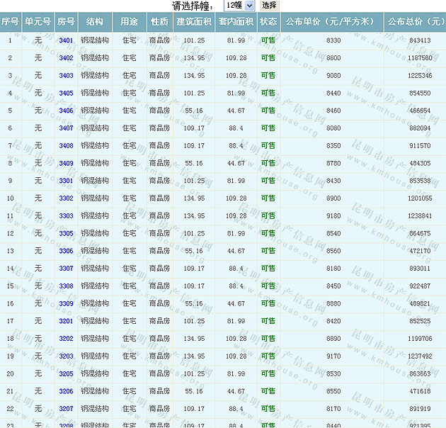 根據云南省物價局關于發布《云南省商品房銷售明碼標價實施細則(試行)》的通知,現將該項目商品住房的準售房源及每套房屋價格向社會公布,房地產開發企業應嚴格按照公布價格,商品房銷售明碼標價實行一套一標。商品房經營者應當對每套商品房按照建筑面具進行明碼標價,否則,房產登記機關不予登記備案。準售房源及房價信息如下: