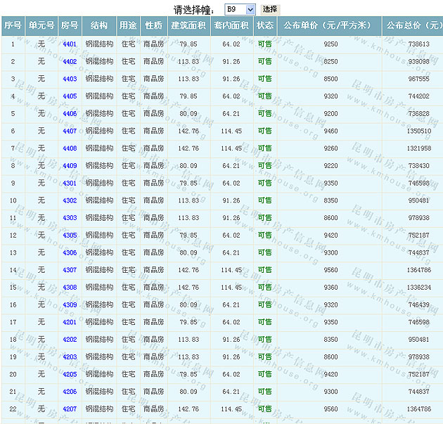 根據云南省物價局關于發布《云南省商品房銷售明碼標價實施細則(試行)》的通知,現將該項目商品住房的準售房源及每套房屋價格向社會公布,房地產開發企業應嚴格按照公布價格,商品房銷售明碼標價實行一套一標。商品房經營者應當對每套商品房按照建筑面具進行明碼標價,否則,房產登記機關不予登記備案。準售房源及房價信息如下: