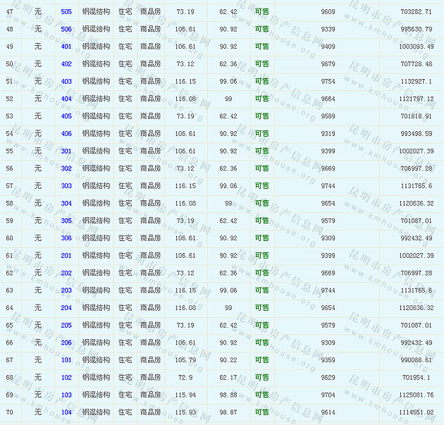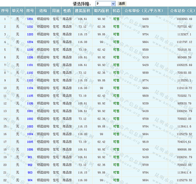 根據云南省物價局關于發布《云南省商品房銷售明碼標價實施細則(試行)》的通知,現將該項目商品住房的準售房源及每套房屋價格向社會公布,房地產開發企業應嚴格按照公布價格,商品房銷售明碼標價實行一套一標。商品房經營者應當對每套商品房按照建筑面具進行明碼標價,否則,房產登記機關不予登記備案。準售房源及房價信息如下: