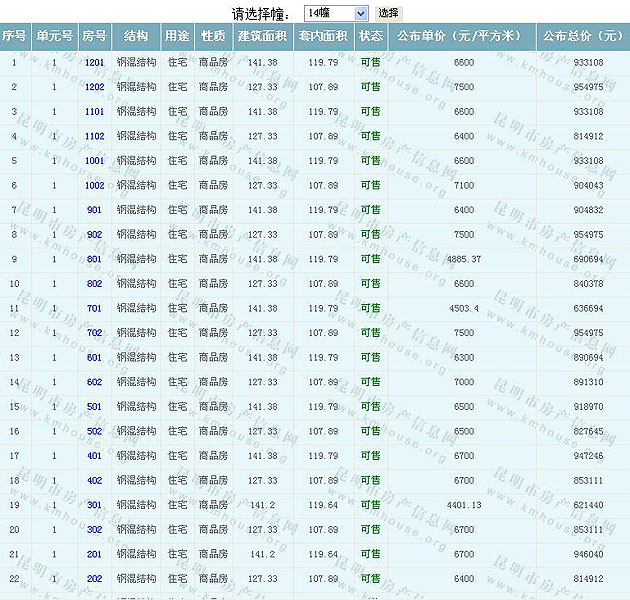 根據(jù)云南省物價(jià)局關(guān)于發(fā)布《云南省商品房銷售明碼標(biāo)價(jià)實(shí)施細(xì)則(試行)》的通知,現(xiàn)將該項(xiàng)目商品住房的準(zhǔn)售房源及每套房屋價(jià)格向社會(huì)公布,房地產(chǎn)開發(fā)企業(yè)應(yīng)嚴(yán)格按照公布價(jià)格,商品房銷售明碼標(biāo)價(jià)實(shí)行一套一標(biāo)。商品房經(jīng)營(yíng)者應(yīng)當(dāng)對(duì)每套商品房按照建筑面具進(jìn)行明碼標(biāo)價(jià),否則,房產(chǎn)登記機(jī)關(guān)不予登記備案。準(zhǔn)售房源及房?jī)r(jià)信息如下: