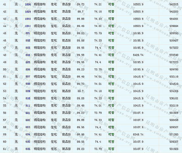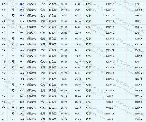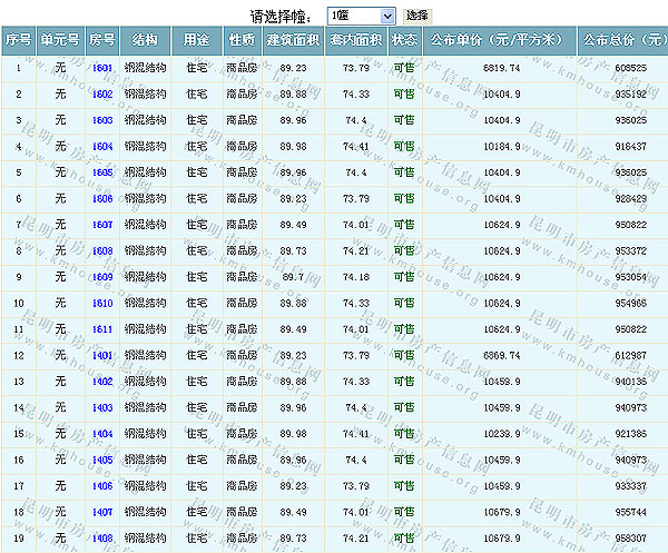 根據云南省物價局關于發布《云南省商品房銷售明碼標價實施細則(試行)》的通知,現將該項目商品住房的準售房源及每套房屋價格向社會公布,房地產開發企業應嚴格按照公布價格,商品房銷售明碼標價實行一套一標。商品房經營者應當對每套商品房按照建筑面具進行明碼標價,否則,房產登記機關不予登記備案。準售房源及房價信息如下: