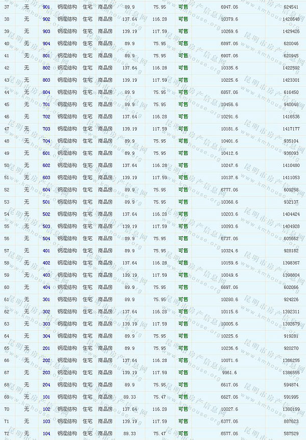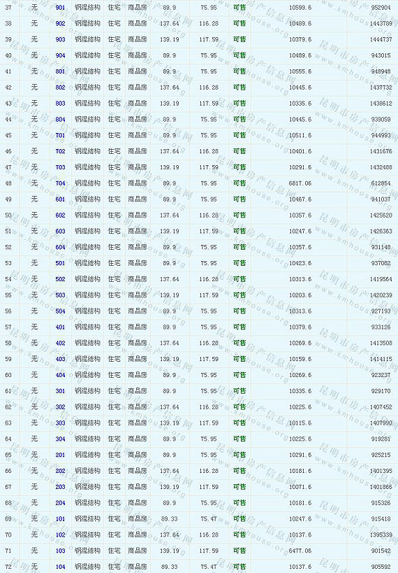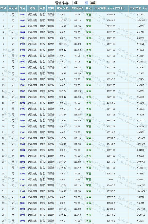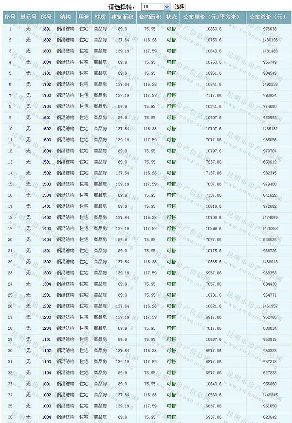 根據云南省物價局關于發布《云南省商品房銷售明碼標價實施細則(試行)》的通知,現將該項目商品住房的準售房源及每套房屋價格向社會公布,房地產開發企業應嚴格按照公布價格,商品房銷售明碼標價實行一套一標。商品房經營者應當對每套商品房按照建筑面具進行明碼標價,否則,房產登記機關不予登記備案。準售房源及房價信息如下: