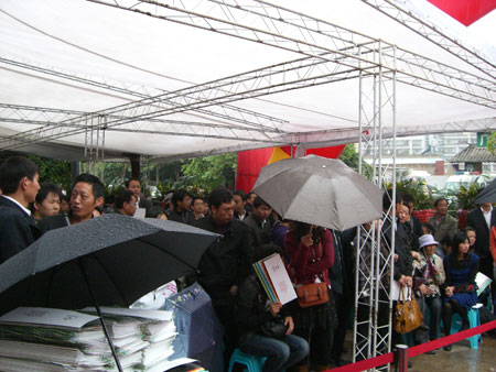 同時歐陽云還表示,今天的客戶量已經(jīng)超過公司的預(yù)期,尤其是9點(diǎn)半以后突然下起雨,購房者的熱情絲毫沒有受到影響,甚至是打著傘在仔細(xì)聽主持人叫號。