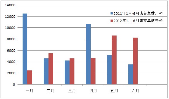 從2011、2012年1至6月昆明商品房成交均價(jià)對(duì)比圖上可以看出,雖然經(jīng)歷了去年嚴(yán)厲的調(diào)控,但是昆明地區(qū)2012年的房?jī)r(jià)與2011年同期相比并沒(méi)有出現(xiàn)較大的跌幅,僅僅是小幅微跌,但是房?jī)r(jià)的上漲卻在調(diào)控中得到了很好的抑制,其中一月到三月的成交均價(jià)都高于去年同期,從成交數(shù)據(jù)可以看出2012年上半年昆明樓市的成交均價(jià)是一個(gè)緩慢單邊下降的趨勢(shì),其中最高成交均價(jià)出現(xiàn)在1月為7538元/平米,最低成交均價(jià)出現(xiàn)在6月為價(jià)格為7421元/平米,也就是說(shuō)上半年昆明樓市成交均價(jià)僅僅下跌了117元,而上半年昆明樓市成交均價(jià)為7473元/平方米。