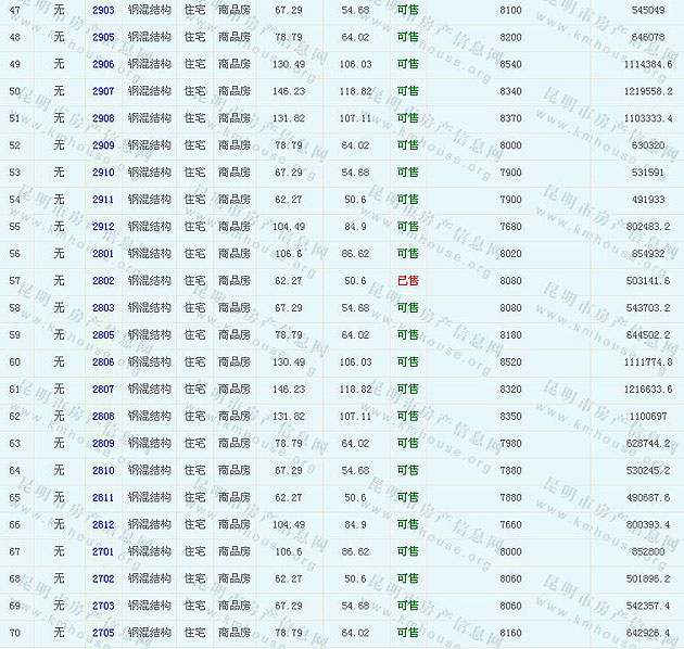 根據(jù)云南省物價局關(guān)于發(fā)布《云南省商品房銷售明碼標價實施細則(試行)》的通知,現(xiàn)將該項目商品住房的準售房源及每套房屋價格向社會公布,房地產(chǎn)開發(fā)企業(yè)應(yīng)嚴格按照公布價格,商品房銷售明碼標價實行一套一標。商品房經(jīng)營者應(yīng)當對每套商品房按照建筑面具進行明碼標價,否則,房產(chǎn)登記機關(guān)不予登記備案。準售房源及房價信息如下: