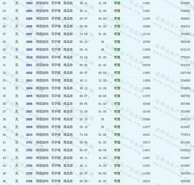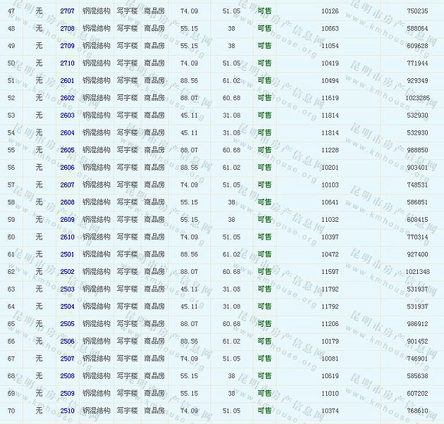 根據(jù)云南省物價(jià)局關(guān)于發(fā)布《云南省商品房銷售明碼標(biāo)價(jià)實(shí)施細(xì)則(試行)》的通知,現(xiàn)將該項(xiàng)目商品住房的準(zhǔn)售房源及每套房屋價(jià)格向社會(huì)公布,房地產(chǎn)開發(fā)企業(yè)應(yīng)嚴(yán)格按照公布價(jià)格,商品房銷售明碼標(biāo)價(jià)實(shí)行一套一標(biāo)。商品房經(jīng)營(yíng)者應(yīng)當(dāng)對(duì)每套商品房按照建筑面具進(jìn)行明碼標(biāo)價(jià),否則,房產(chǎn)登記機(jī)關(guān)不予登記備案。準(zhǔn)售房源及房?jī)r(jià)信息如下: