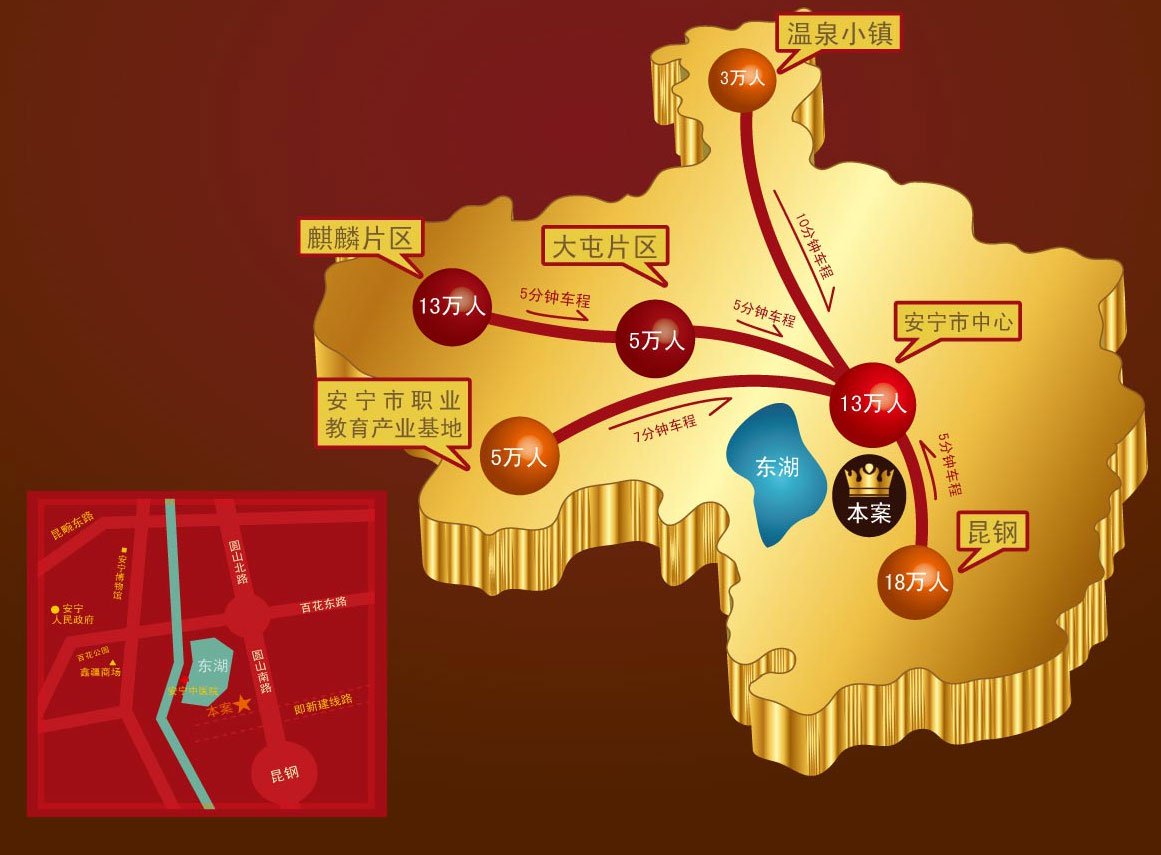 | ● [ 依托東湖商圈 ] 東湖良好的自然環境,使其已經逐漸成為安寧中心公園,大量的人流為東湖商圈的形成提供了基礎,隨著東湖周邊舊城改造以及空置地塊的開發,東湖商圈正在逐漸形成; | |