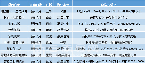 - 5月份是昆明樓市的一個開盤高峰期,不完全統計下來,有20多個項目開盤入市,爭相“拋售”住宅。6月份計劃開盤的項目有所減少,僅有融創春風十里海豚灣、華潤悅府、中海云麓九里、碧桂園北城映象、綠地滇池國際健康城等9個樓盤計劃開盤入市。其中,融創春風十里海豚灣推售的是公寓,單價預計9000-12000元/平方米,價格相對親民,其余已曝光預估價格的項目,單價都在萬元以上。
