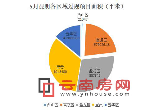 根據昆明市規劃局發布的信息統計,5月份昆明有14個項目過規,過規項目用地577531.73平米,過規總建筑面積302.1291萬平米。相比去年5月昆明4個項目過規,總建筑面積為61萬方,同比上漲241萬方。比較4月份11項目過規面積325萬方,環比略有下跌,減少約23萬方。不過,5月份過規總量還是處于高位