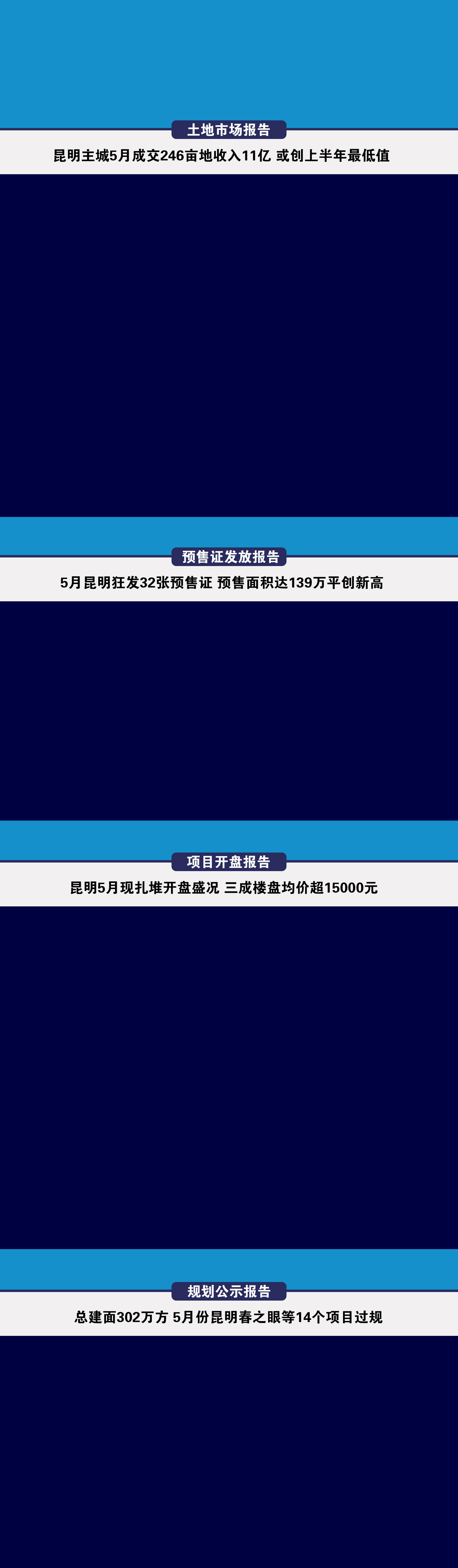 - 據不完全統計,今年5月份昆明主城五區有19個樓盤22次開盤,向市場推售了至少4000套住房,其中有三成樓盤開盤均價超過15000元/平方米。這是自2014年以來,昆明推售住房數量最多的一個月。對此,有業內人士表示,5月份眾多樓盤扎堆入市,恐怕是想搶在新政出臺之前拋售存貨,因為坊間傳言,自4月份國家住建局約談昆明市之后,昆明已在制定新的房地產調控新政,只待審批后出臺。